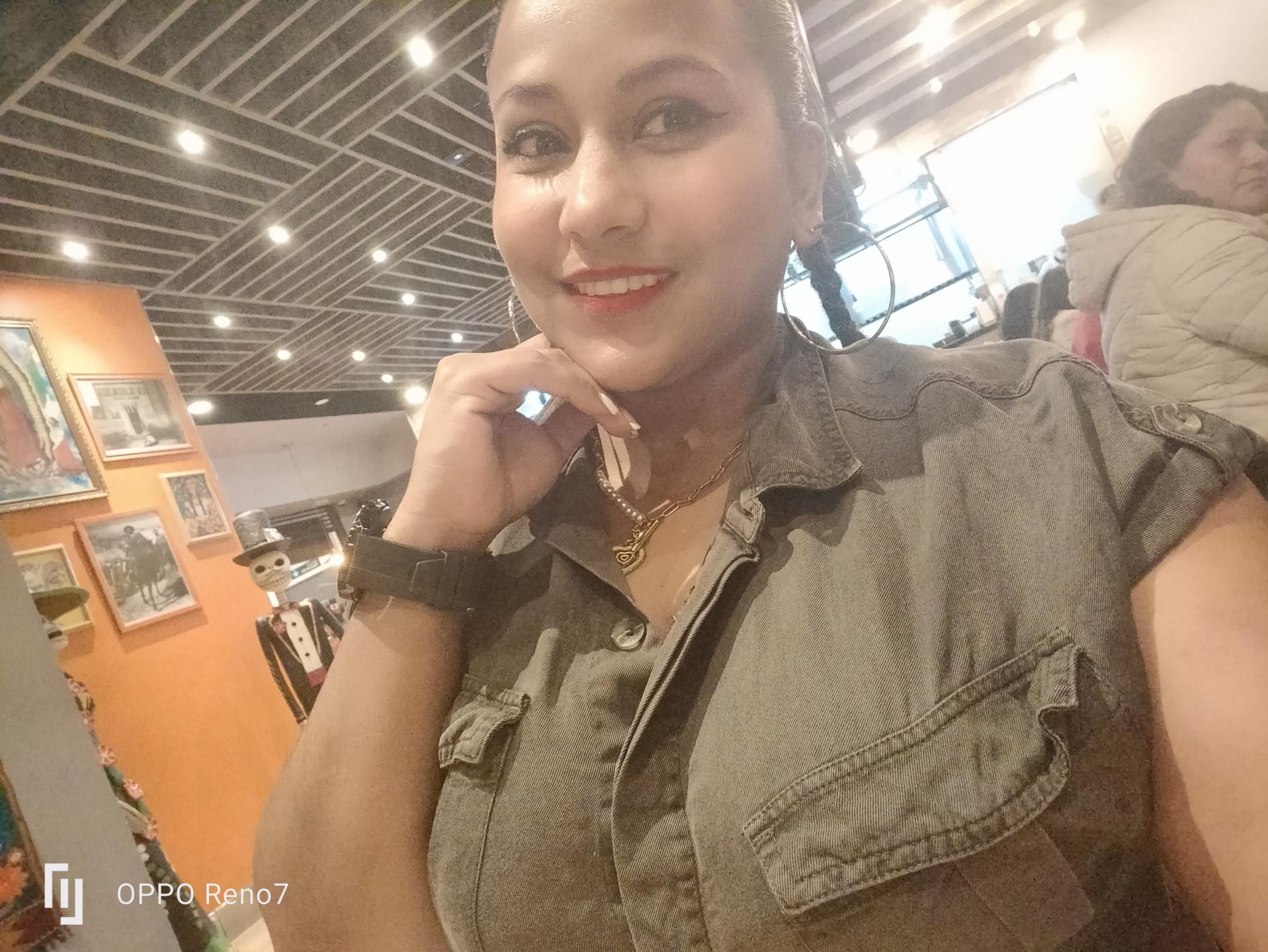 "She is a dark-haired woman of captivating beauty, with warm and luminous skin that reflects light in a soft way. Her dark, silky and voluminous hair unfolds in natural waves that frame her face, giving a touch of mystery and sophistication. Her eyes, large and deep-toned, have an intense and lively gaze, which conveys a combination of confidence and sweetness. The softness of his features, added to his charming smile, makes his presence even more magnetic. With an innate elegance, every gesture seems thoughtful, yet fluid and natural. Their energy is serene yet powerful, and in their moving company, time seems to fly